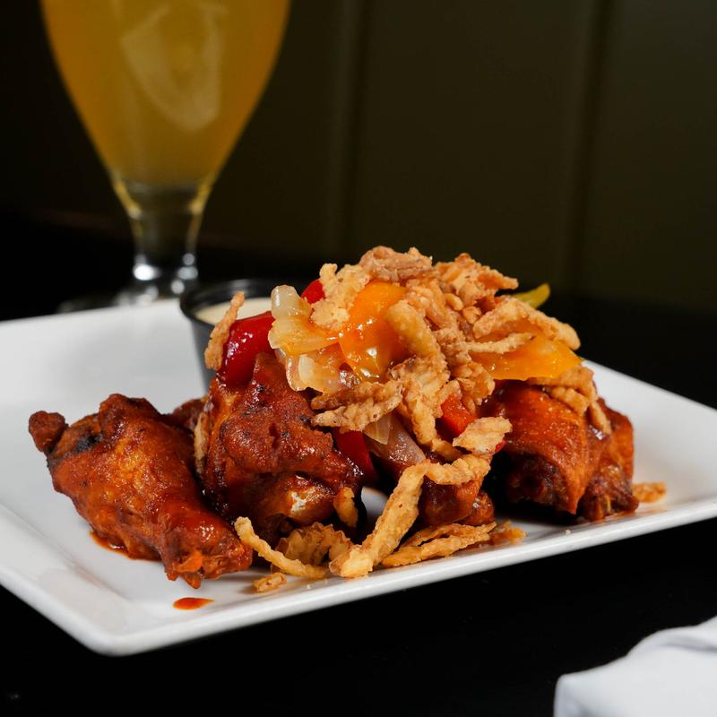 50/50: buffalo BBQ, pepper relish, Alabama white sauce classic.
