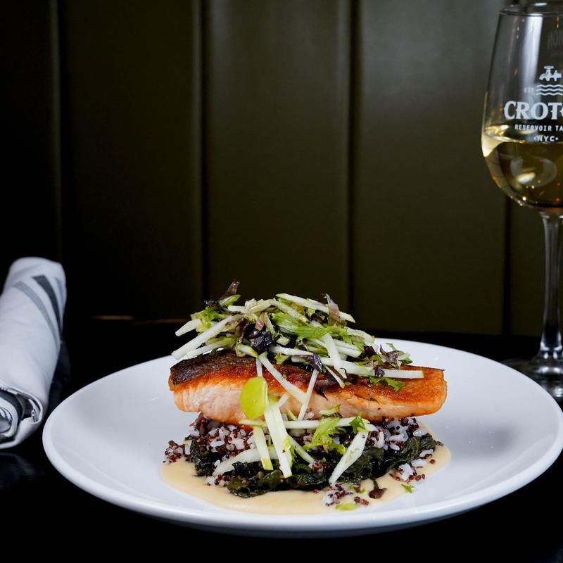 Salmon, ancient grains, braised Swiss chard, apple butter, apple and herb salad (dairy, gluten)