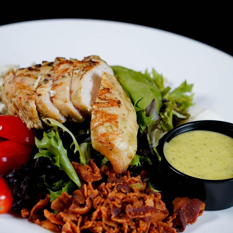 Mesclun, grilled chicken, crumbled bacon, blue cheese, egg, avocado, tomato, herb vinaigrette