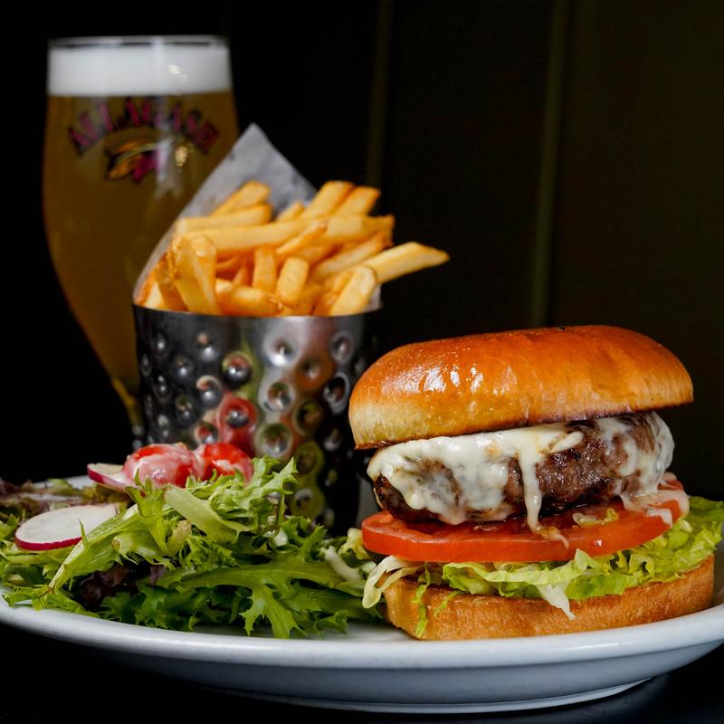 8oz patty, gorgonzola, shredded romaine, roasted garlic crema, brioche bun (dairy, gluten)