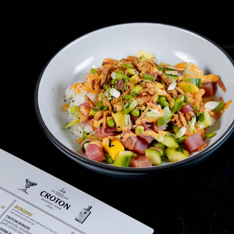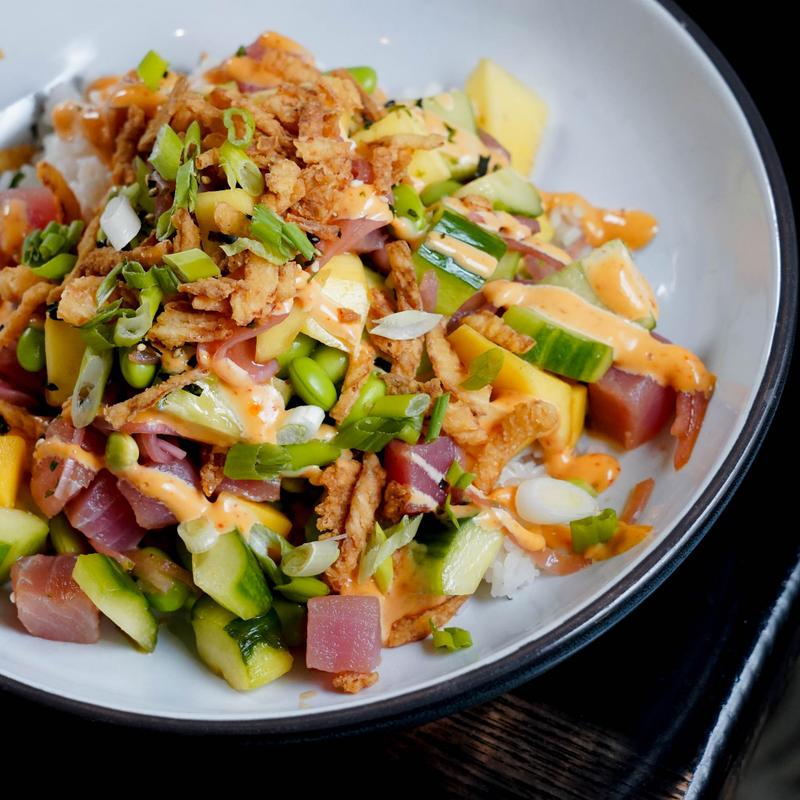 Siracha, tuna, mayo, cucumber, edamame, pickled onion, mango, crispy onions, sticky rice, furikake