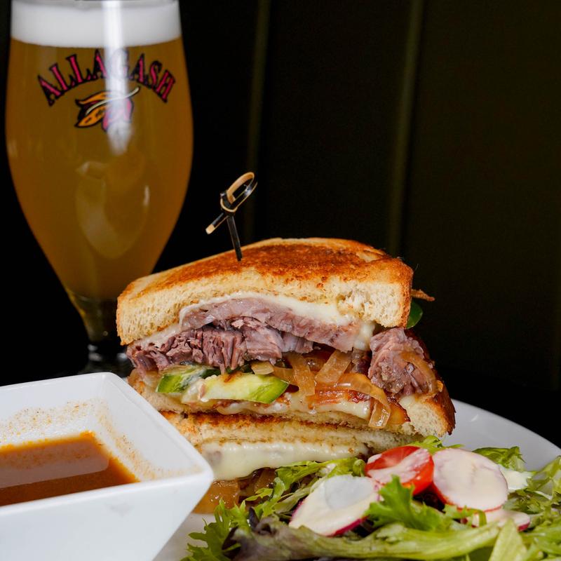Onion, cheddar cheese, bacon, jalapeños, yogurt spread, toasted sourdough, jus